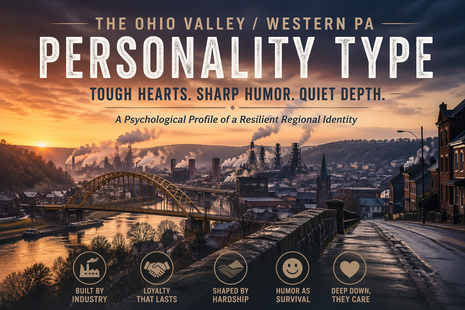 The Ohio Valley / western Pennsylvania personality type was forged where rivers met factories, where winters were cold, where jobs disappeared, where families stayed, where jokes covered pain, and where love often showed up wearing work boots.